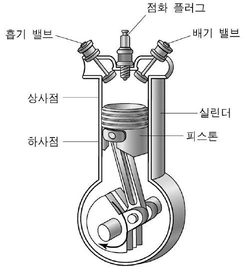 엔진의 동력은 흡기, 압축, 폭발, 배기의 4행정을 순차적으로 거쳐 생산된다. 흡기 행정에서는 흡기 밸브를 열고 피스톤을 상사점에서 하사점으로 이동시킨다. 이때 실린더 내부 압력이 대기압보다 낮아져 공기가 유입되는데, 흡입되는 공기에 연료를 분사하여 공기와 함께 연료를 섞어 넣는다. 압축 행정에서는 실린더를 밀폐시키고 피스톤을 다시 상사점으로 밀어 공기와 연료의 혼합 기체를 압축한다. 폭발 행정에서는 피스톤이 상사점에 이를 즈음에 점화 플러그에 불꽃을 일으켜 압축된 혼합 기체를 연소시킨다. 압축된 혼합 기체가 폭발적으로 연소되면서 실린더 내부 압력이 급격히 높아지고, 외부 대기압과의 압력 차이에 의해 피스톤이 하사점으로 밀리면서 동력이 발생한다. 배기 행정에서는 배기 밸브가 열리고 남아 있는 압력에 의해 연소 가스가 외부로 급격히 빠져나간다. 피스톤이 다시 상사점으로 움직이면 흡기 때와는 반대로 부피가 줄면서 대기압보다 내부 압력이 높아지므로 잔류 가스가 모두 배출된다.
