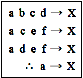 일치법은 왼쪽과 같은 도식으로 정리할 수 있다. X는 원인을 알고 싶은 결과이고, a, b, c, d, e, f는 여러 가지 선행하는 요소를 뜻한다. a는 X가 일어나는 모든경우에 공통되는 유일한 요소이므로 a가 X의 원인이라고 결론을 내린다.