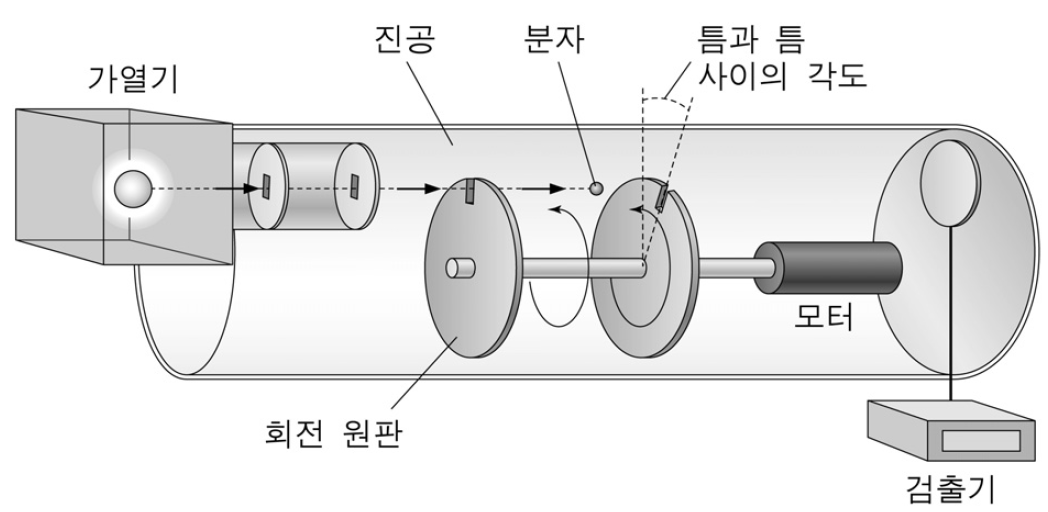 그림은 맥스웰 속력 분포를 알아보기 위해서 밀러와 쿠슈가 사용했던 실험 장치를 나타낸 것이다. 가열기와 검출기 사이에 두 개의 회전 원판이 놓여 있다. 각각의 원판에는 가는 틈이 있고 두 원판은 서로 연결되어 있다. 두 원판은 일정한 속력으로 회전하면서 특정한 속력 구간을 가진 분자들을 선택적으로 통과시킬 수 있다.
