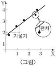 한편, 그래프에서 가로축과 세로축 두 변수의 관계를 대변하는 최적의 직선의 기울기와 절편은 최소 제곱법으로 구할 수 있다. 우선, 그래프에 두 변수의 순서쌍을 나타낸 점들 사이를 지나는 임의의 직선을 그린다. 각 점에서 가로축에 수직 방향으로 직선까지의 거리인 편차의 절댓값을 구하고 이들을 각각 제곱하여 모두 합한 것이 ‘편차 제곱 합’이며, 편차 제곱 합이 가장 작은 직선을 구하는 것이 최소 제곱법이다.