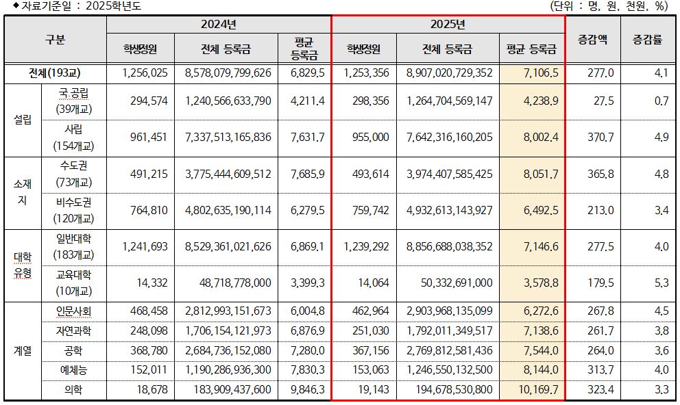 2025 대학별 등록금 현황