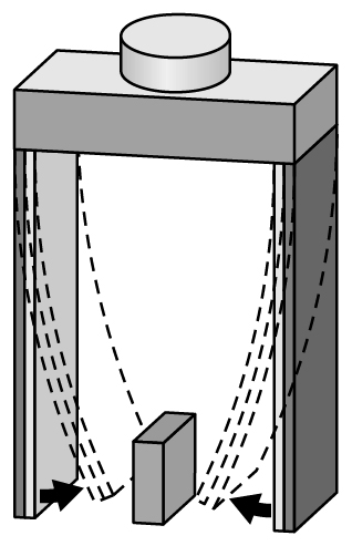 두 물질을 접합하여 두 층으로 만든, 두 종류의 띠 a와 b가 있다. 두 물질의 선형 열팽창 계수의 차이는 b가 a보다 크고, 두께와 길이는 a, b 모두 같다. 이 띠를 활용하여 오른쪽 그림과 같이 띠가 안으로 휘어 물체를 잡는 집게를 만들었다. a를 두 개 사용한 것은 집게 A이고, b를 두 개 사용한 것은 집게 B이다. 온도 T0에서 A와 B의 모든 띠는 평평한 형태였다. 이후 온도를 T1로 올렸을 때는 B만 물체를 잡을 수 있었다. 그런데 T0에서 T1보다 높은 온도인 T2로 온도를 올렸을 때는 A도 물체를 잡을 수 있었다. (단, 선형 열팽창 계수 차이, 온도 변화 외에 휨에 영향을 주는 다른 요소는 고려하지 않음.)