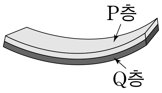 선형 열팽창 계수가 다른, 두 종류의 물질 P와 Q를 서로 같은 두께의 두 층으로 접합하여 평평한 띠를 만든다고 하자.